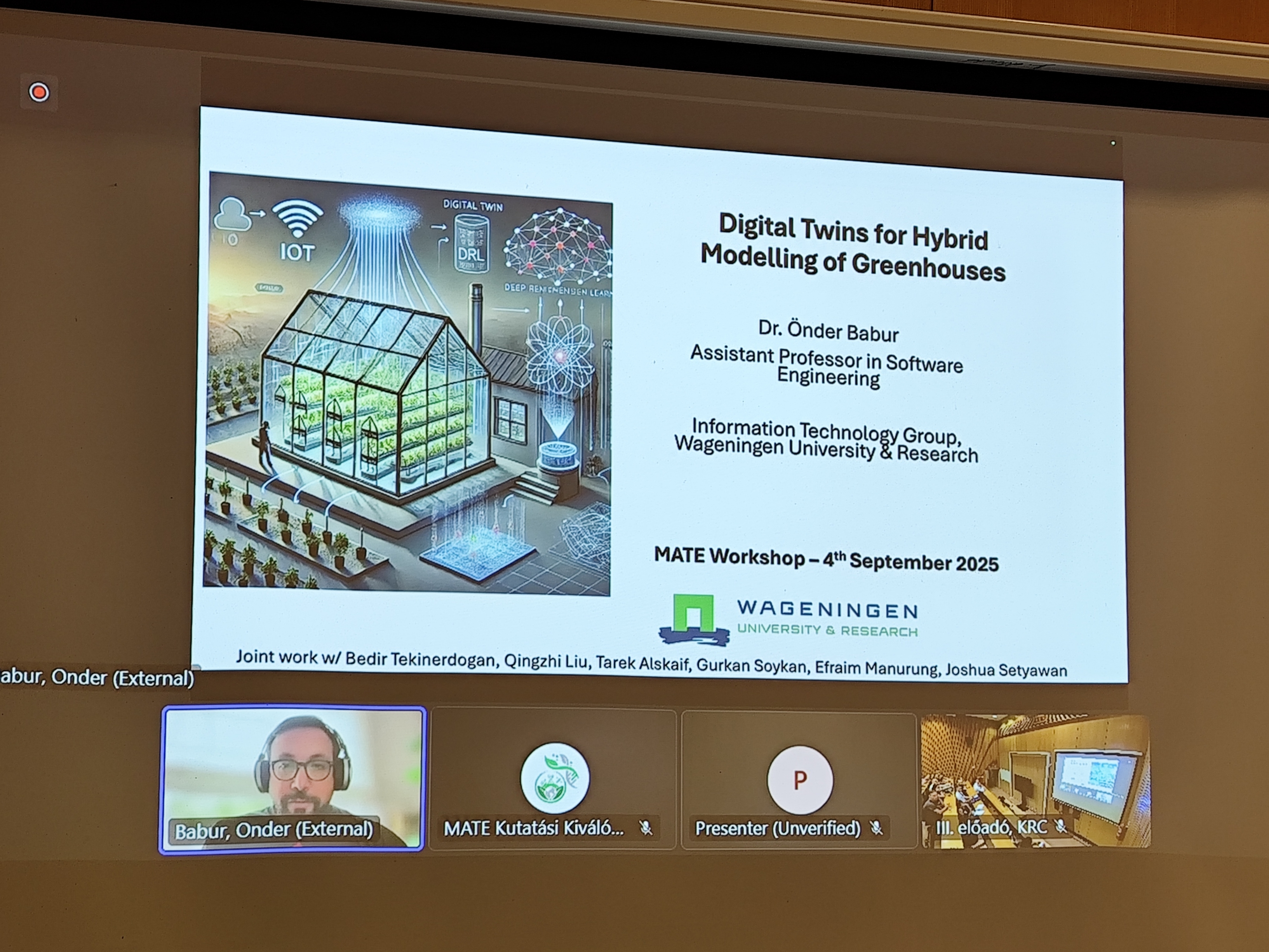 Dr. Önder Babur, professor of Information Technology Group at Wageningen University, delivered a straightforward online presentation about the digital twin framework they are developing, in context of greenhouse vegetable production. In his presentation, Dr. Babur highlighted the importance of integrating physics-based and data-driven models to enable accurate, adaptive greenhouse climate control. He demonstrated how combining white-box and black-box approaches can reduce the simulation-to-reality gap and showcased three different examples about the combined utilization in the newly founded Digital Twin Lab at Wageningen University.