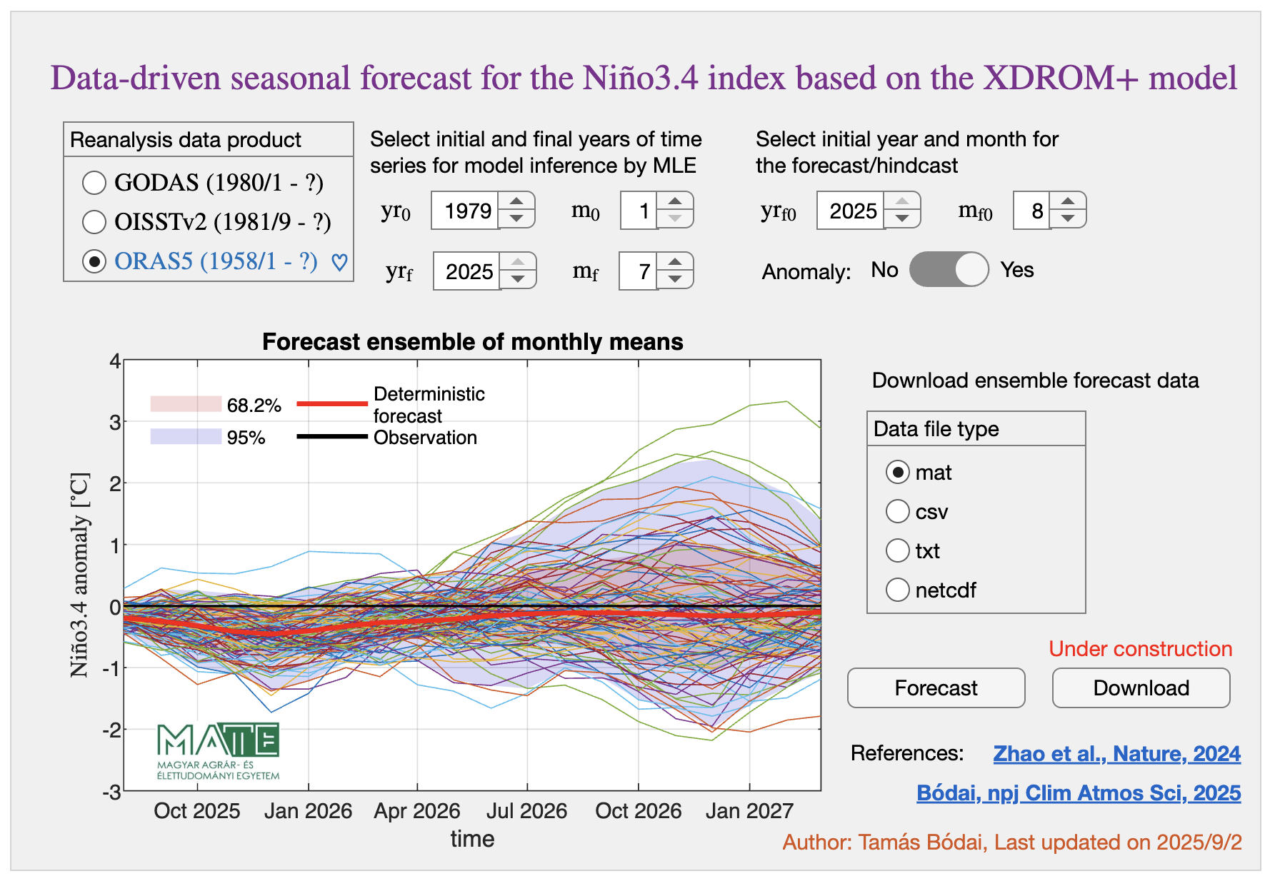 Subsequently, research at MATE focused on improving the estimation of the model’s parameters. This led to a breakthrough forecast model that delivers the most accurate ENSO predictions to date. Web application link.